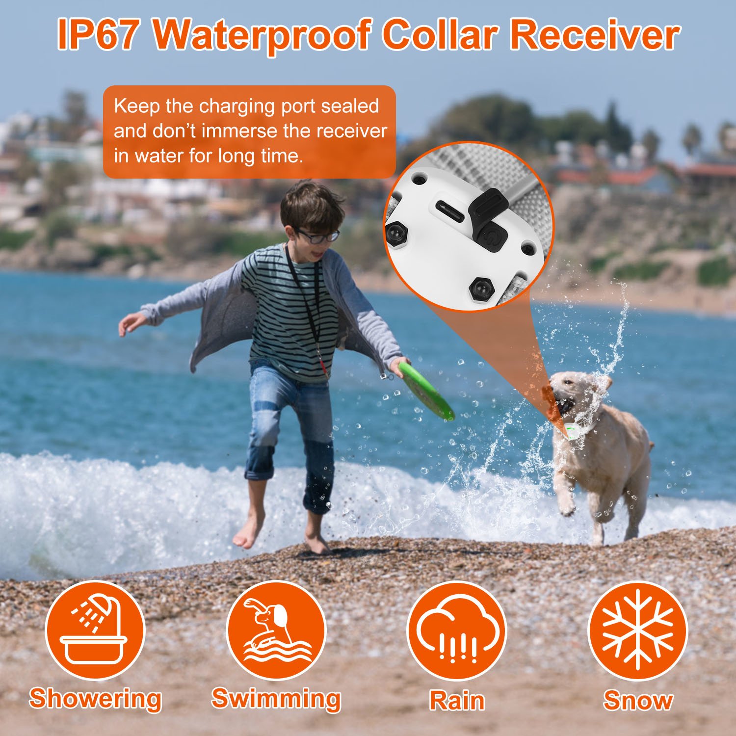 *Adjustable Collar & Waterproof Receiver*:With an adjustable neck circumference of 3.9-27.6in,it’s suitable for small,medium,and large dogs between 10-150lbs.The IP67 waterproof receiver can work normally when your dog swims or runs in the rain. Make sure that the charging port is well-sealed before the dog runs into water.
