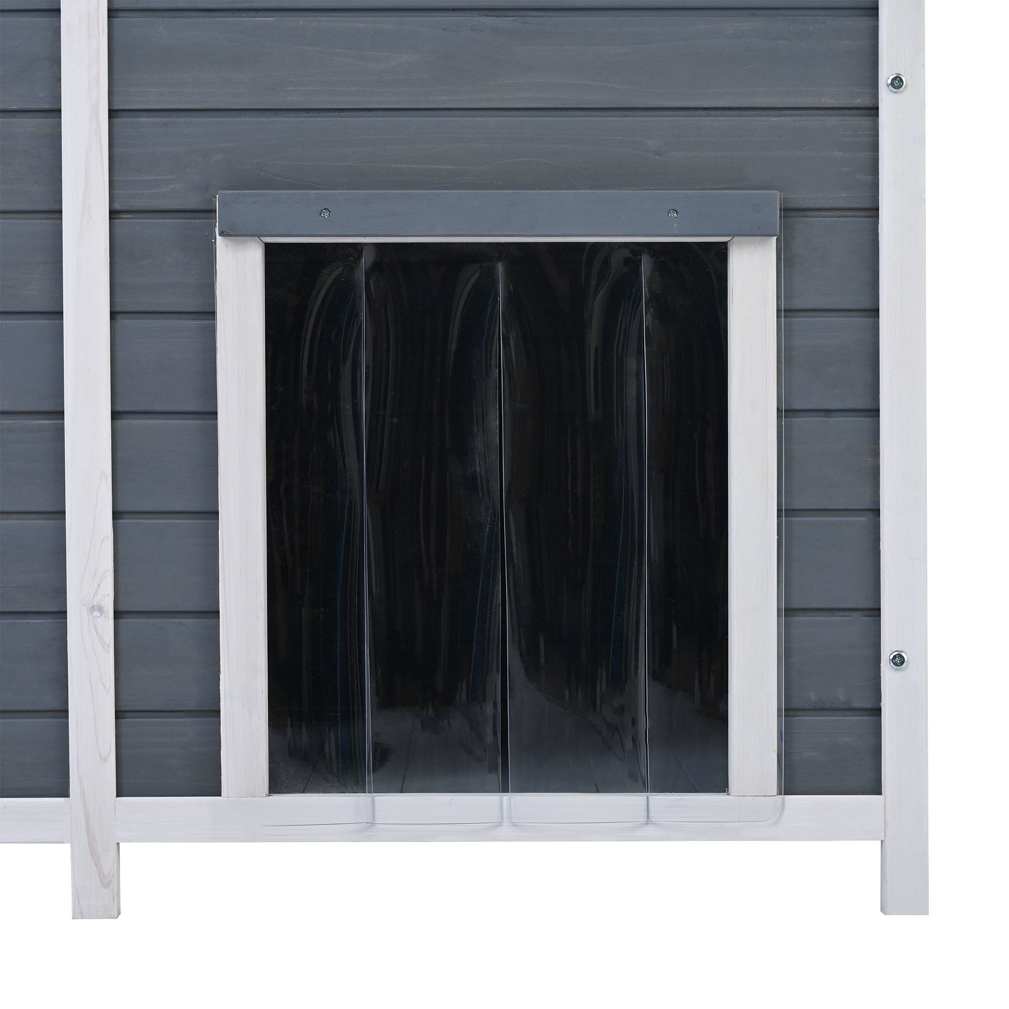 3.[Modern Design] Raised floor, 2" ground clearance, allows air to circulate under Kennel keeping the floor dry and comfortable. And there are 2 plastic door curtains, it can resist the wind to a certain extent.