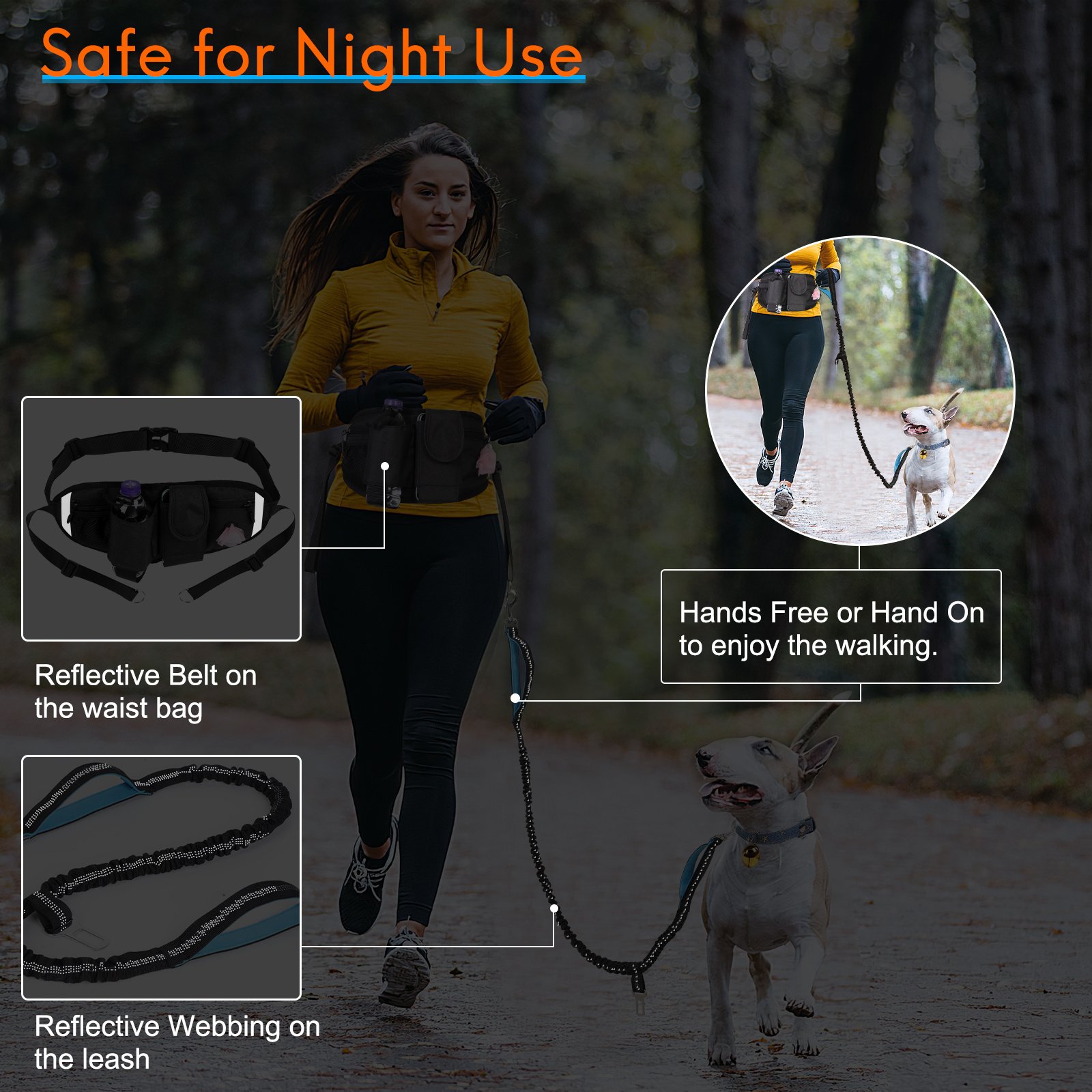 Home > Hands Free Dog Leash with Waist Bag for Walking Small Medium Large Dogs; Reflective Bungee Leash with Car Seatbelt Buckle and Dual Padded Handles; A