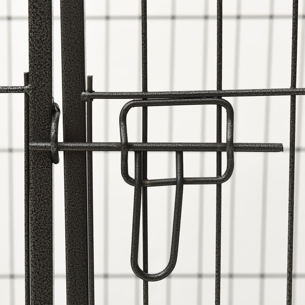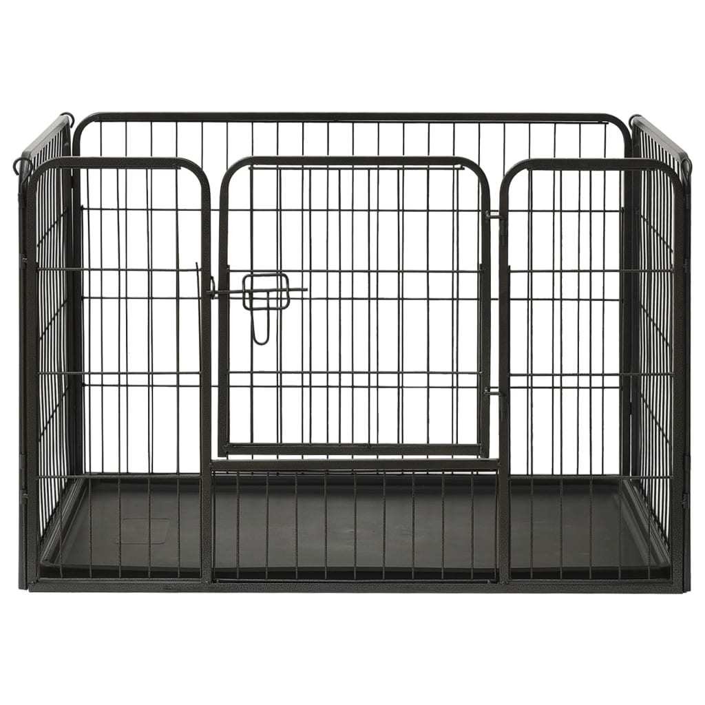 This dog playpen can be easily set up or taken down. It features a hinged door with a security latch for easy access. This durable and weather-resistant playpen is made of rustproof powder-coated steel, making it suitable for outdoor and indoor use. A plastic bottom tray is also included in the delivery.