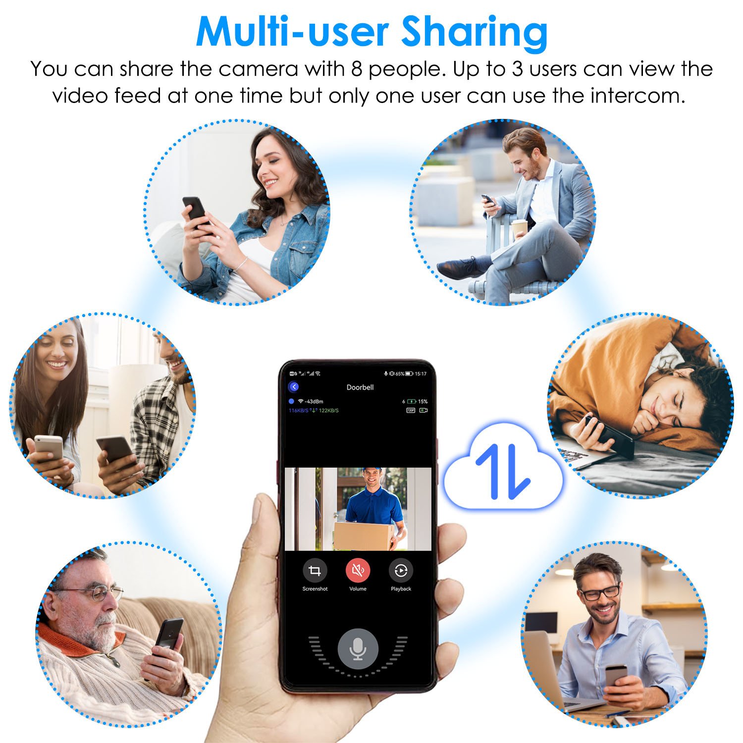 *Multi-user Function*:You can share the camera with 8 people. Up to 3 users can view the video feed at one time but only one user can use the intercom. This doorbell only supports cloud storage. The first 3-month cloud storage is for free.