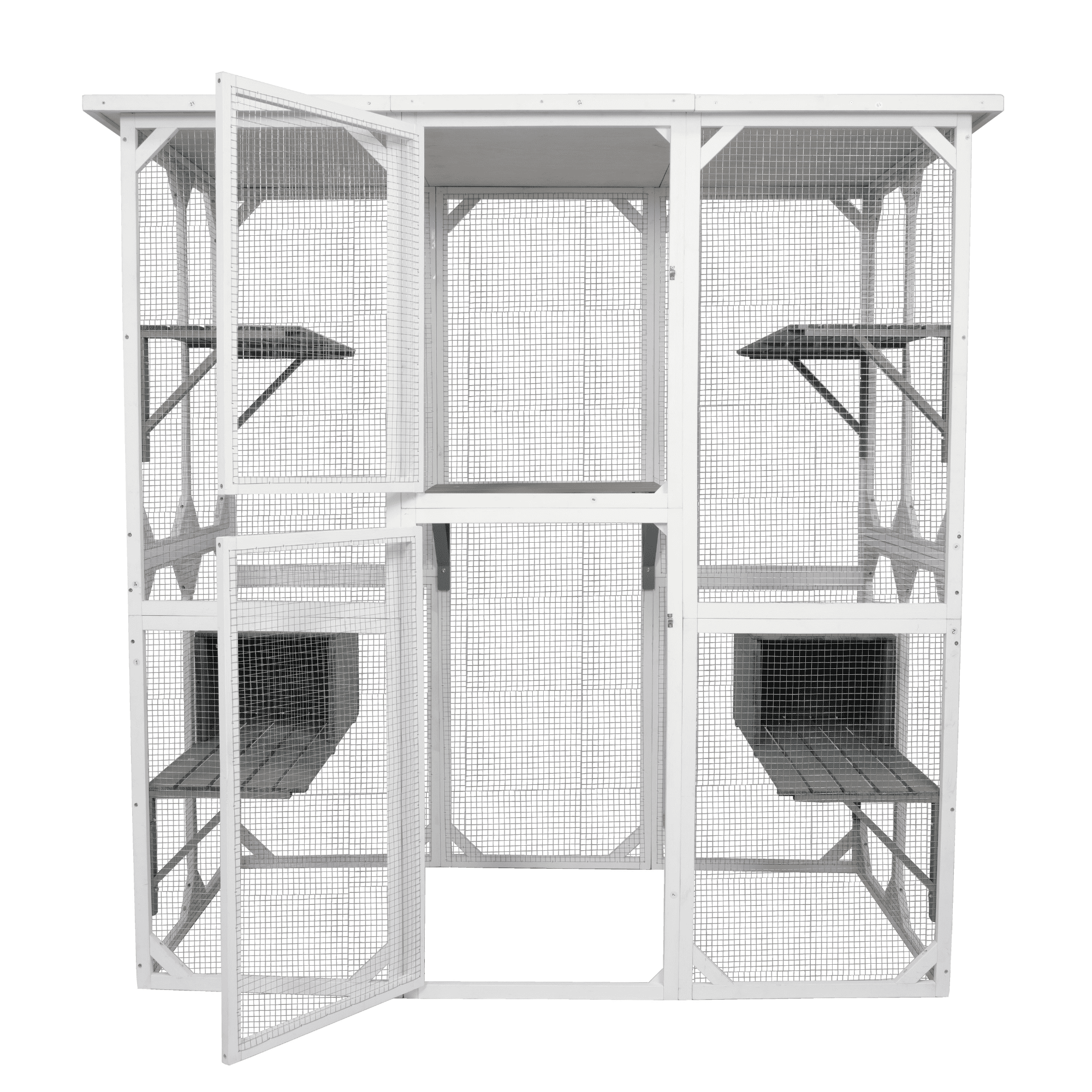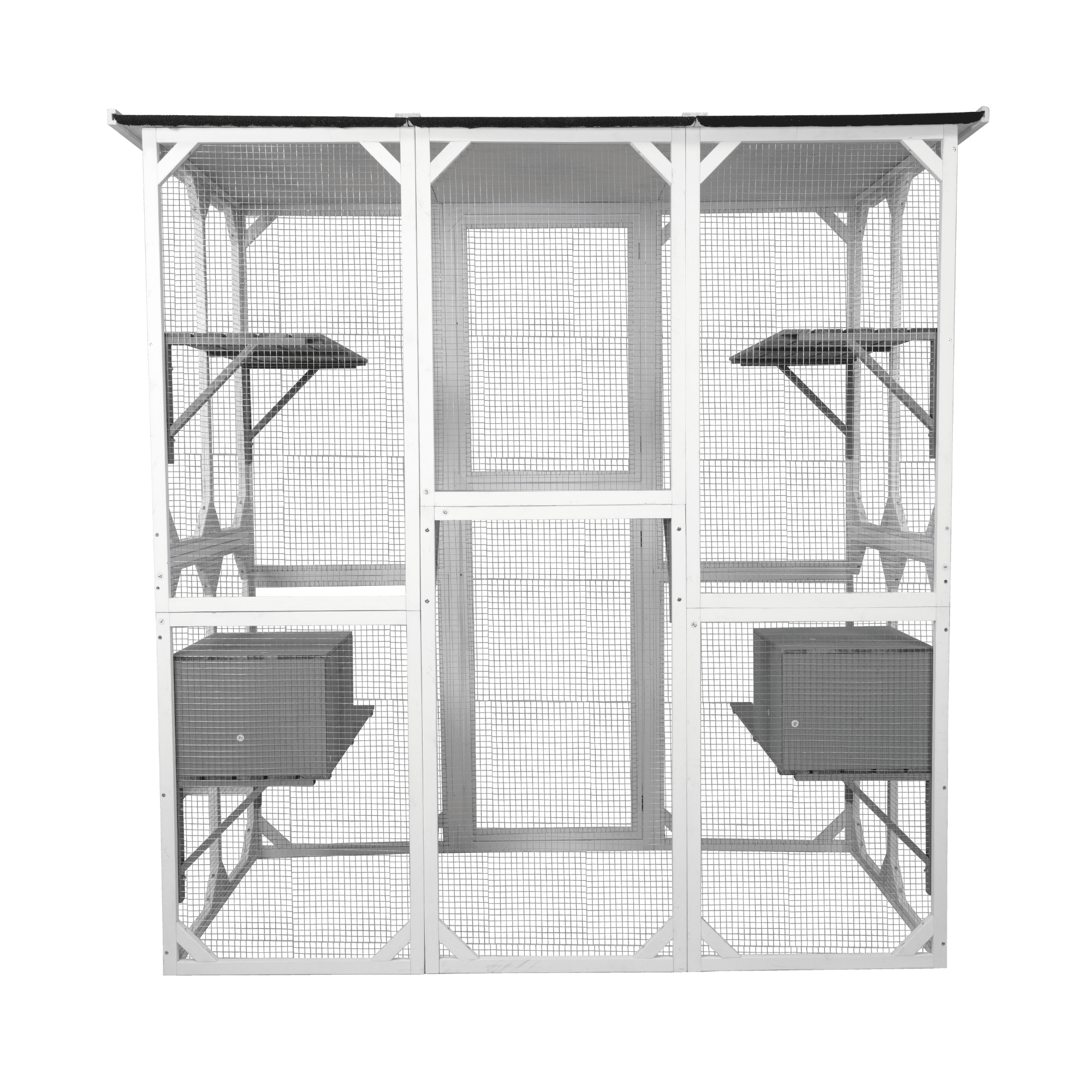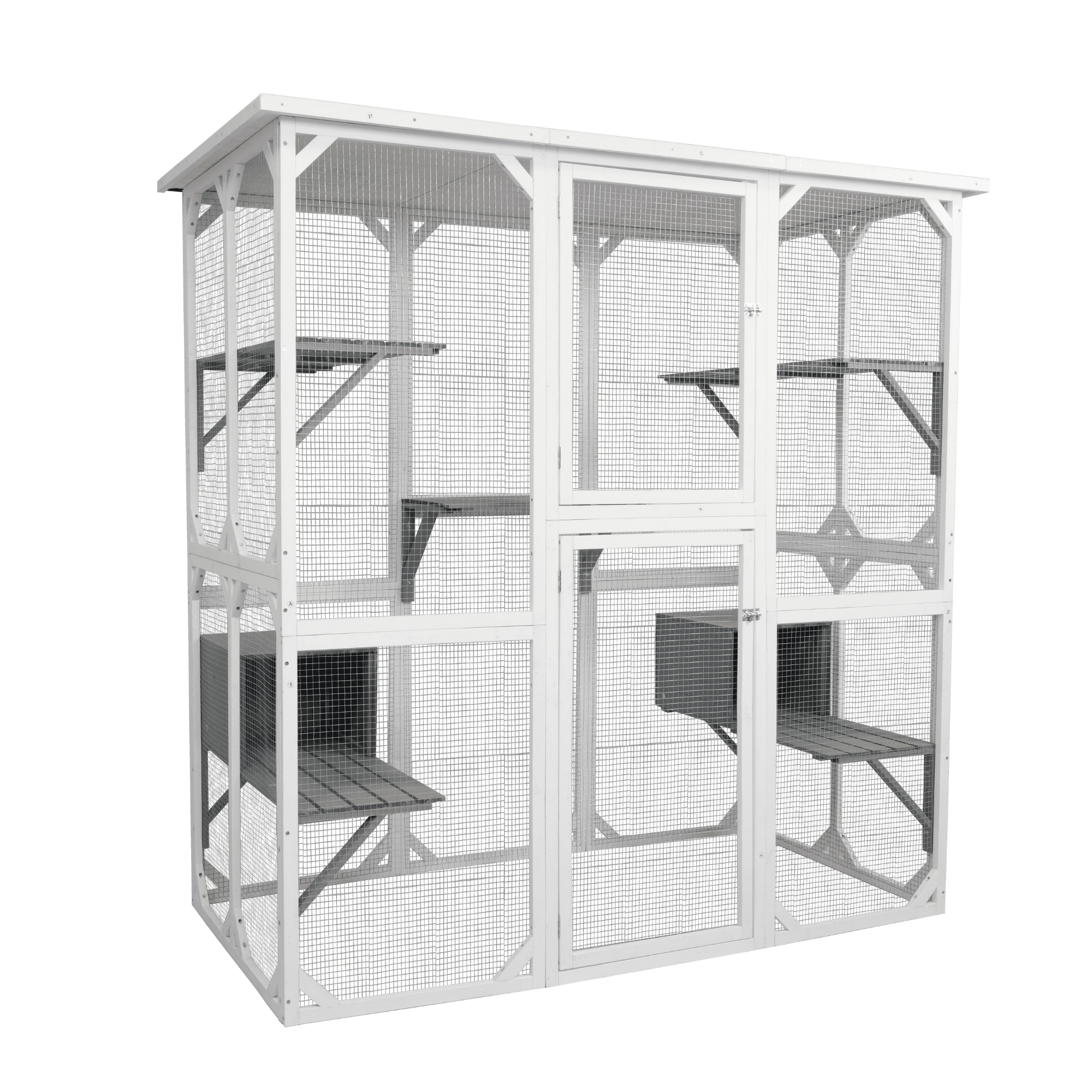 CAT HOUSEHello! Thank you for considering our newest product, the medium-sized cat cage. Our designers have carefully crafted this cage specifically for your furry feline friends, ensuring that it is not only functional but also stylish.With a length of 70.08 inches, a width of 37.41 inches, and a height of 71.26 inches, this cage provides ample space for your cat to move around comfortably. Inside, there are specially designed platforms for cats to jump and play on, as well as a cozy sleeping nook for them to snuggle up in.The cage is made entirely of wood, giving it a sturdy and durable feel. To add an extra touch of protection against the elements, the top has been covered with a layer of asphalt roofing to ensure that your cats stay dry even on rainy days.