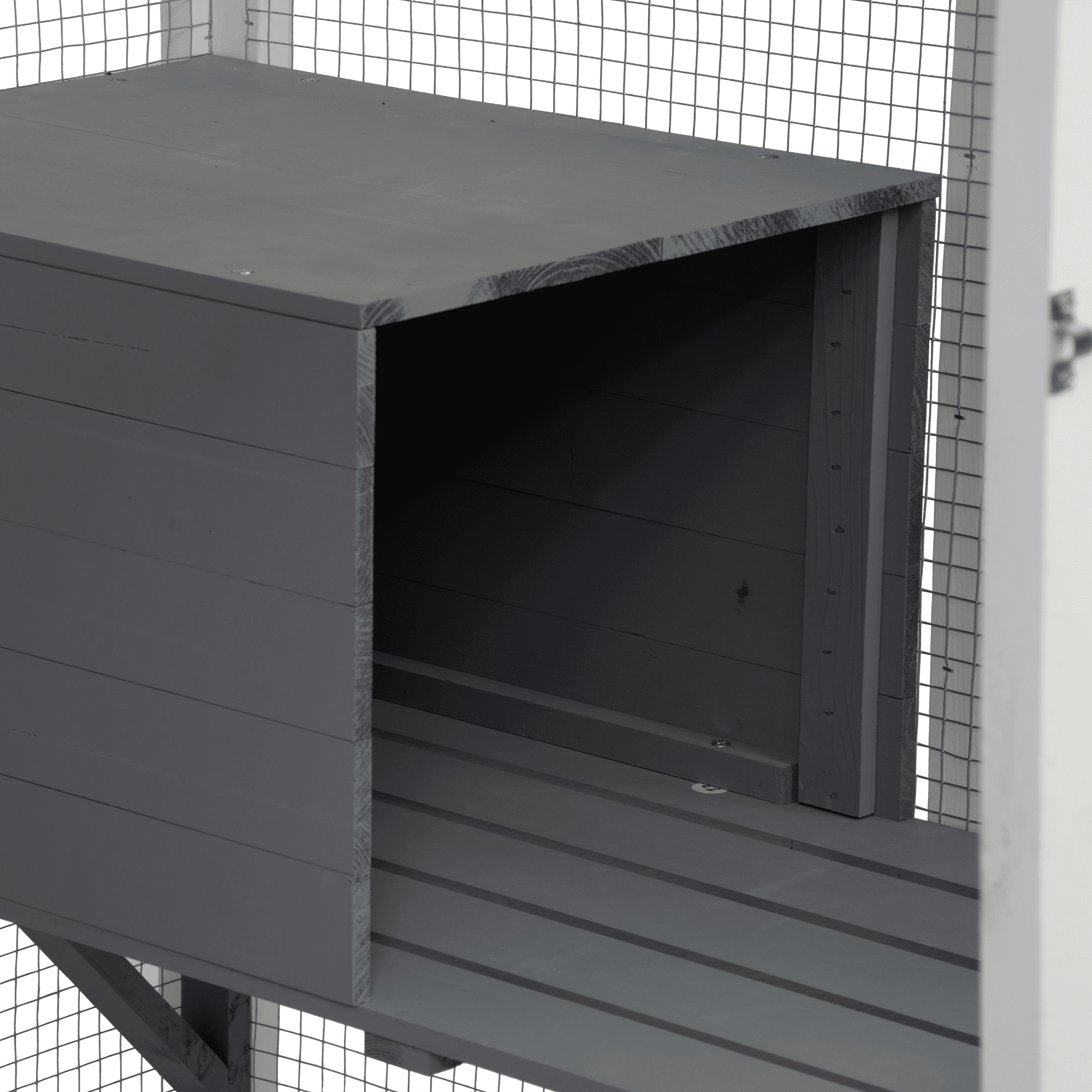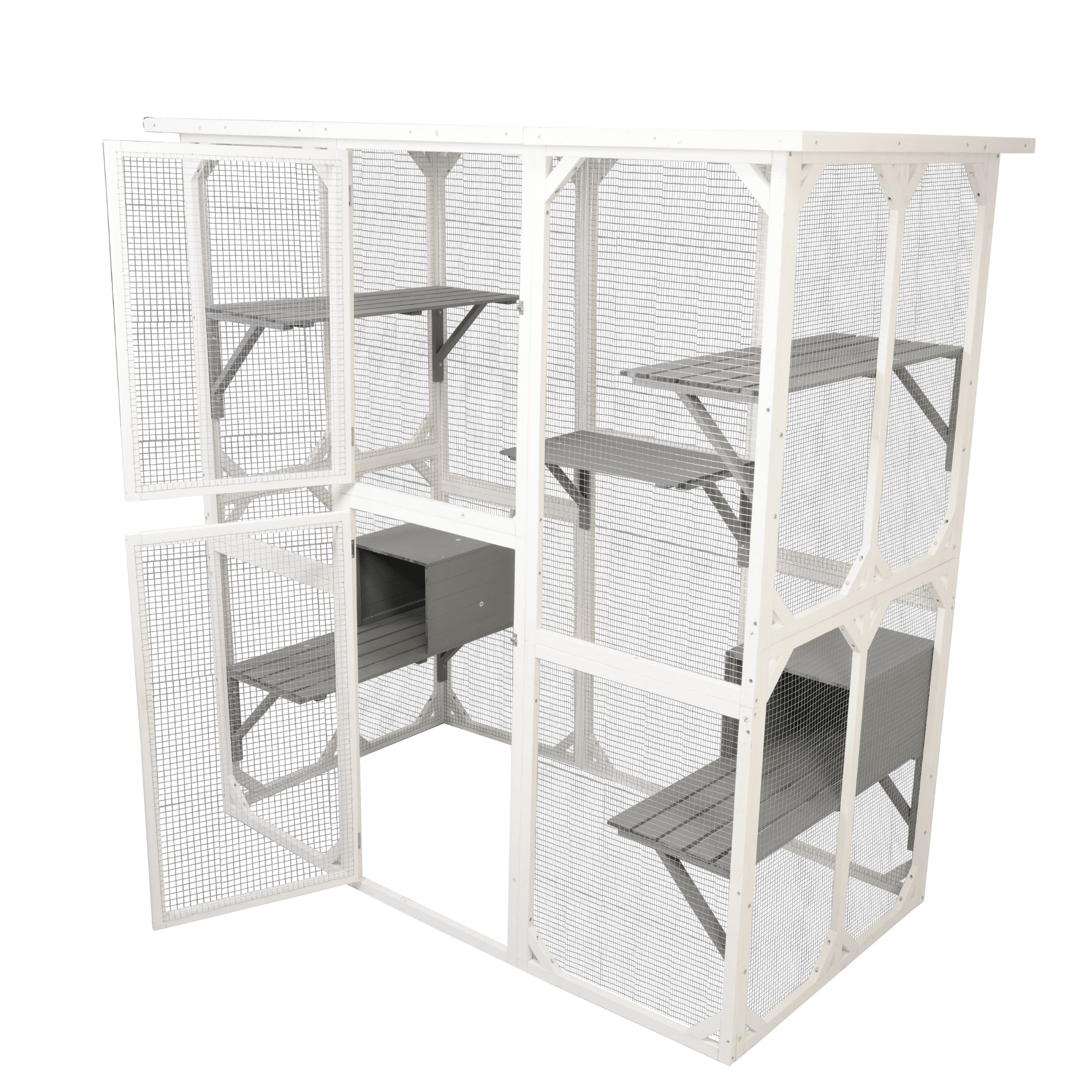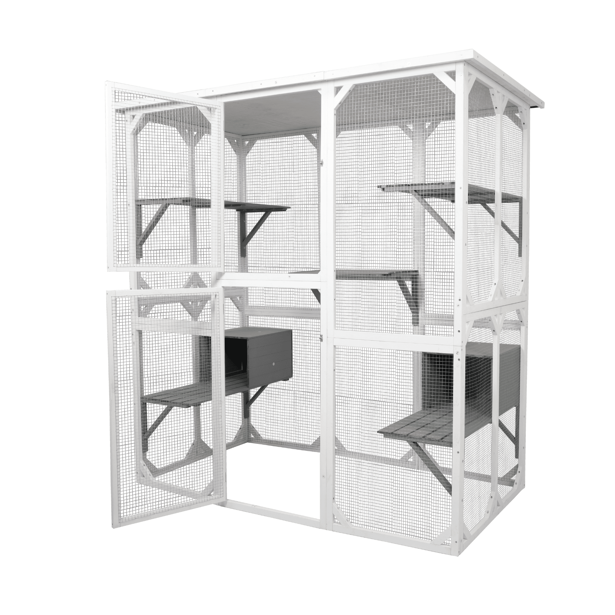 CAT HOUSEHello! Thank you for considering our newest product, the medium-sized cat cage. Our designers have carefully crafted this cage specifically for your furry feline friends, ensuring that it is not only functional but also stylish.With a length of 70.08 inches, a width of 37.41 inches, and a height of 71.26 inches, this cage provides ample space for your cat to move around comfortably. Inside, there are specially designed platforms for cats to jump and play on, as well as a cozy sleeping nook for them to snuggle up in.The cage is made entirely of wood, giving it a sturdy and durable feel. To add an extra touch of protection against the elements, the top has been covered with a layer of asphalt roofing to ensure that your cats stay dry even on rainy days.